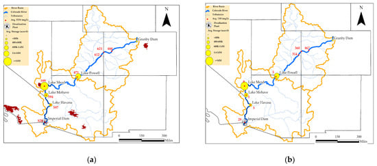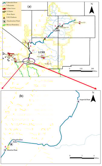The salt in the Colorado River system is abundant and naturally occurring. A significant number of saline sediments in the CRB were deposited in prehistoric marine conditions. Salts contained in sedimentary rocks are readily erodible, dissolved, and discharged into the river system []. In general, the level of salinity in the river increases as it flows downstream with a concentration of about 50 mg/L at its headwaters to about 850 mg/L where it crosses the border between the US and Mexico. On average each year, about nine million tons of salt are carried past the Hoover Dam, which is the uppermost point at which numerical requirements have been established on the river [,].