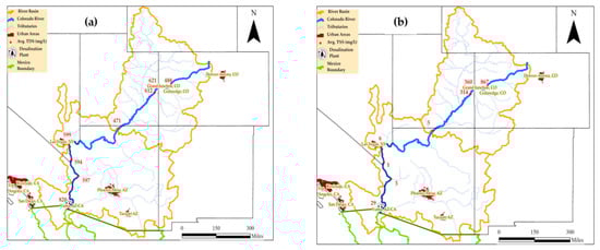 The issues of salinity in the river basin cause annual economic damages in a sum exceeding USD 300 million negatively impacting over 36 million people and 4.5 million acres of irrigated lands [,,,]. A total of 55% of the dissolved solids in the river basin are accounted for by natural saline springs, natural surface runoff, erosion of saline geologic formations, and groundwater flow. A total of 37% of the salt contributions into the river come from irrigated agricultural lands using both natural and reclaimed wastewater. The remaining 8% of the dissolved solids in the basin are accounted for by evaporative processes and industrial and municipal sources [,]. The economic damages caused to the river are estimated to rise to USD 471 million annually by the year 2025 according to the US Bureau of Reclamation []. These damages are due to measures put by the US to reduce the TDS load contained in the water discharged to the Republic of Mexico in the international 1944 Water Treaty signed between the two countries []. The treaty stipulates the delivery of 1.8 billion m3 per year from the Colorado River to the Republic of Mexico in compliance with Minute 242 [,]. The CRB Salinity Control Act consequently tasks the Secretaries of the US Department of Agriculture (USDA) and the Department of the Interior to ensure the preservation and safeguarding of the water in the Colorado River. Title I of the Act requires the construction, maintenance, and operation of desalting plants, brine discharge canal, and other facilities to ensure the delivery of water to the Republic of Mexico from the Morelos Dam with a concentration of TDSs no more than 115 ± 30 mg/L above the yearly mean annual flow-weighted TDS concentration which arrives at the Imperial Dam (across the California/Arizona border) of the river. The CRB states adopt different numerical values for TDS concentrations of 879, 747, and 723 (concentrations in mg/L), respectively, for locations below the Imperial, Parker, and Hover Dams [,,].