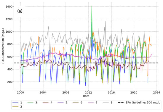 The time series of the TDS and TSS concentrations for the studied period (2000–2023) is presented in Figure 6 to assess the temporal variation of the WQPs. It is observed from Figure 6a that there are variations in the TDS concentrations with Station 8 showing generally higher concentrations. The level of TDS increases from Station 1 near Cameo to Station 8 below the Morelos Dam, an indication of the rise in TDS from upstream of the river to downstream as described in Section 3.1. There are year to year variations in the amounts of TDS for the studied period highlighting the impacts of the watershed activities of the period with an unusual dramatic rise in the TDS concentration in Station 3 near Cisco, located in Grand County, Utah, during the years 2012/2013. The spike in the TDS in the years 2012/13 could be due to intense snowmelt that year coupled with anthropogenic activities such as agriculture. The Colorado River near Cisco received flows from the Dolores and San Miguel Rivers. The Dolores River flows about 240 miles and drains an arid region of the Colorado Plateau. The San Miguel River joins the Dolores River which flows into the Colorado River. The headwaters of the Dolores River are traced to the San Juan Mountains which is known to be a great spot for fishing for several kinds of trout []. These rivers are potential sources of increased dissolved salts in the Colorado River. The TSSs appear to be relatively low for all the stations except for Stations 1 and 2. Stations located below or above show relatively low concentrations of TSSs indicating the direct influence of storage on the settling and sedimentations of suspended solids. USGS Station 2 is found to be the significant source of TSSs for the Colorado River over the studied period except in 2021 where there was a spike in the TSSs from Station 1 possibly due to an unusual snowmelt which increased the flow and transportation of sediments into the river. Station 2, located near Colorado–Utah state line, receives flow from the Gunnison River which is one of the major tributaries of the Colorado River []. The tributary contributes about one-third of Colorado’s flow at the state line station. Flows from the Gunnison River move through a steep-gradient, narrow Black Canyon channel located in the Gunnison National Park which is a possible conduit of loaded sediments in the Colorado River []. The station also receives flow from the urbanized Grand Junction, CO, located in Mesa County with highly impervious surfaces which could accelerate the transport of sediments into the river. Grand Junction’s primary industry before the discovery of its mineral riches was agriculture. The mining of the deposits of coal, radium, copper, uranium, and vanadium and the operations of the mining activities [] could be significant contributors to the release of sediments to the Colorado River raising the TSS concentrations at USGS Station 2.