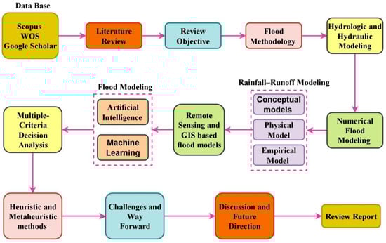 This study conducts an in-depth assessment of flood models in order to assess the current degree of understanding and expertise of these models []. The review aims to synthesize the body of information available on several flood model types, and identify the benefits, drawbacks, and challenges of each. At present, there are many systematic reviews on traditional flood modeling []. State-of-the-art benchmarking reviews are also available for many flood modeling packages. Significant amounts of literature are available on flood mitigation and management strategies, such as structural flood protection, sustainable urban drainage systems (SUDS), sponge cities, and blue-green infrastructure []. This review article offers a distinct contribution by comprehensively addressing various methods used in flood models, including hydrologic, hydraulic, numerical, rainfall–runoff, remote sensing and GIS-based, artificial intelligence and machine learning-based, multiple-criteria decision analysis-based models, as well as heuristic and metaheuristic approaches. While existing reviews often focus on specific areas such as hydrology, hydraulics, or remote sensing, or the use of artificial intelligence and machine learning-based approaches, this review takes a broader perspective to encompass multiple modeling techniques employed in flood studies. Rather than focusing on a specific aspect of flood modeling, this review bridges the gap between different methodologies and provides readers with a holistic overview. It allows readers to explore and grasp the benefits and challenges associated with each model type. By consolidating this diverse information, the review supports a deeper understanding of flood modeling practices, facilitating informed decision-making and the development of effective flood management strategies. One of the notable advantages of this review is its ability to present a comprehensive picture of flood modeling by considering multiple methodologies in a single article. This allows readers to compare and contrast different approaches, gaining insights into their respective strengths and weaknesses. Such a broad perspective is particularly valuable for researchers and practitioners who seek to explore a wide range of flood modeling techniques, or require a comprehensive understanding of the field.