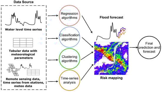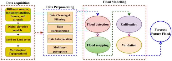 The entire process involves three primary stages, which are data collection, the selection of appropriate machine learning models, flood forecasting, prediction, and risk mapping. Data of all kinds are gathered in the first step, including time series of water levels, data from remote sensing, and tabular data. ML models are chosen in the second step depending on the features of the data and the prediction issue. Regression techniques may be used to estimate flood levels using historical data, such as linear regression [] and support vector regression []. The output variable and the input variables, such as the weather and the soil moisture levels, are mathematically related by these algorithms []. Based on input characteristics including topography, soil type, and previous flood history, classification algorithms, such as decision trees and random forests, can categorize locations into high, medium, or low risk of flooding []. It is possible to identify flood-prone locations and prioritize them for flood prevention and mitigation activities by using clustering algorithms such as hierarchical clustering and k-means to group together areas with comparable flood risk factors [].