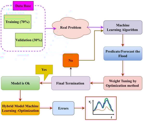 Flood modeling using artificial intelligence (AI) and machine learning (ML) is a relatively new field that has the potential to revolutionize the way floods are predicted and managed [,]. AI and ML algorithms are used to analyze large amounts of data, including meteorological, hydrological, and topographical data, to improve the accuracy and reliability of flood models. ML technology enables systems to improve themselves through experience without the need for explicit programming [,]. ML methodologies involve a learning process that seeks to accomplish a given task by learning from past experiences []. To evaluate the performance of an ML model for a particular task, a performance metric is utilized to enhance the learning experience [,]. There are four categories of ML technology based on learning methods, namely, supervised learning, unsupervised learning, semi-supervised learning, and reinforcement learning [].