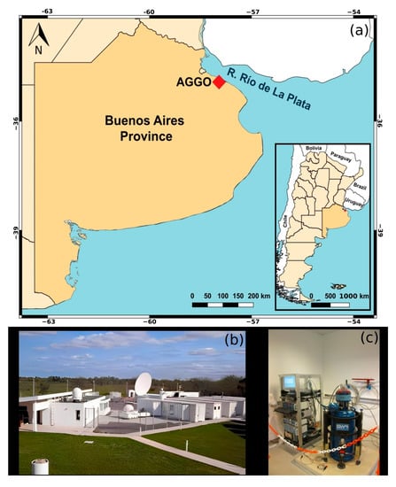 AGGO is a fundamental geodetic observatory located in Parque Pereyra Iraola, Berazategui, Argentina (Figure 1). AGGO is equipped with the main geodetic techniques such as VLBI, SRL, GNSS, absolute gravimetry, and a superconducting gravimeter (SG038) which has been continuously measuring temporal gravity changes since December 2015 []. It is worth noting that, the SG038 is currently the only SG operating in Latin America and the Caribbean. In addition to geodetic techniques, hydrometeorological sensors have been installed at AGGO. A weather station with sensors for air temperature, relative humidity, short and long wave radiation, wind speed, and two rain gauges were installed in April 2016. Soil moisture sensors were installed in several profiles between 5 and 450 cm depth and are located in the vicinity of the SG038. The hydrometeorological dataset is available in Mikolaj et al. [].