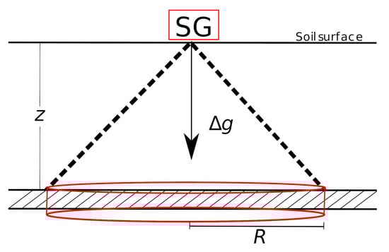 According to Newton’s law, the gravimetric signal decreases with the square of the distance. Thus, SGs are more sensitive to nearby mass variations. To define the radius of influence R of an SG, we will consider the gravimetric effect of an infinite horizontal layer of water at depth z. The gravity response of a 1 mm thick layer water is 0.42 nm s−2, which is usually referred to as water admittance [] and is independent of the depth z []. Since the SG accuracy is in the range 0.1–0.3 nm s−2, these devices can detect water layers with thicknesses from 0.2 to 0.7 mm thick.