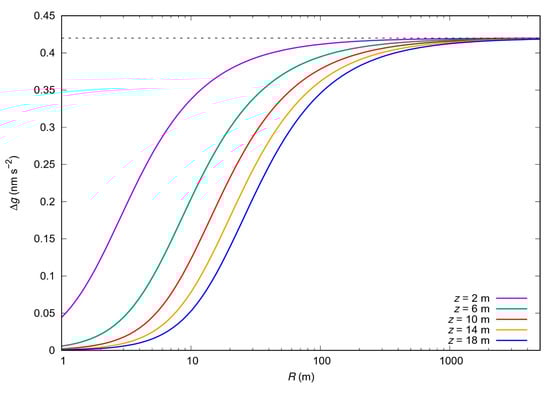 Figure 3 shows the gravity effect (Δg) as a function of R for different depths. Note that when R tends to infinity in Equation (1), we obtain the value of water admittance (0.42 nm s−2). However, 99% of the gravity signal comes from an area of radius 200 to 2000 m, depending on the depth. Moreover, from Equation (1) it can be shown that approximately 99% of the signal originates within a radius: