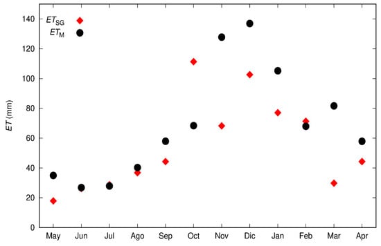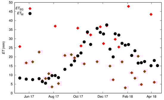 The main differences between both ET monthly estimates can be attributed to the MOD16A2 algorithm. Specifically, the MOD16A2 algorithm does not directly account for soil moisture variations when estimating ET. Instead, it is constrained by the daily vapour pressure deficit, relative humidity, and minimum air temperature []. This approach is based on the assumption of congruence between near surface atmosphere and soil moisture conditions at coarser spatio-temporal scales [,]. The SG method does not require any constraints related to soil moisture to estimate ET. SGs implicitly record the variations in soil moisture, so there is no need to measure or model the water content in the soil profile.