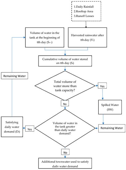 9]. As the accumulated rainwater in the tank may become full, in every timestep available tank storage (which is successive accumulated runoff minus demand) is compared with the accumulated runoffs. If, at any stage, the accumulated runoff become larger than the available storage, the excess water (accumulated runoff—tank volume) is considered as having overflowed from the system. In every timestep (i.e., day), the daily demand is deducted from the accumulated water in the tank. If demand on a day becomes higher than the remaining amount in the tank, the model calculates the shortfall which is expected to be met by the normal town water supply. The detailed description of the model formulations and logical sequences, as well as the accuracy of the model estimations, are presented in a study by Imteaz et al. [