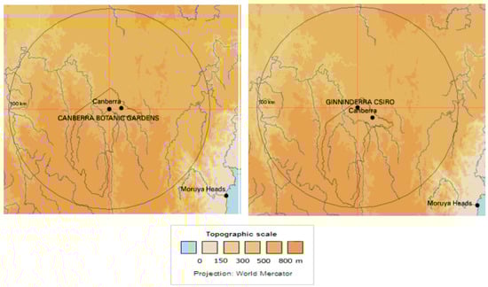 The Australian National Botanic Garden is located near to the city centre and its surrounding is a mixture of plants (i.e., green area), wetland and developed impervious surfaces. Due to the presence of wetland, this area is likely to release more evaporation from water surfaces. The surrounding of ‘Ginninderra CSIRO’ is mostly plants and grass, which is likely to release more evapotranspiration. However, the effects of such localised evaporation and evapotranspiration become diluted when they reach the atmosphere, where such vapour-laden air is often transported by wind speed. The topographic features of the two stations are shown in