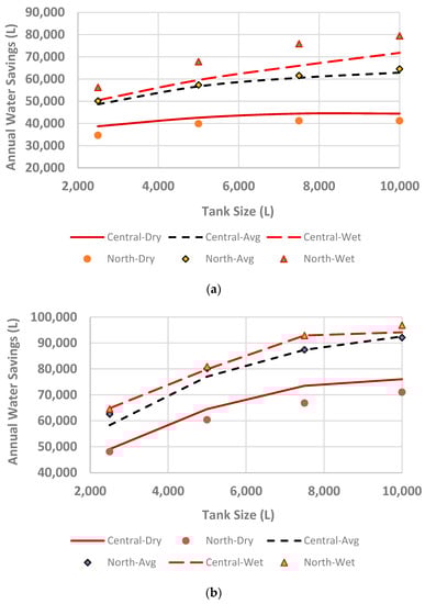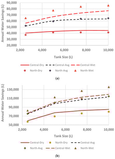 Figure 5a,b shows the variations of annual water saving with different tank sizes up to 10,000 L under different weather conditions for a higher non-potable water demand scenario (600 L/day, i.e., 4 people) for two roof areas; (i)
