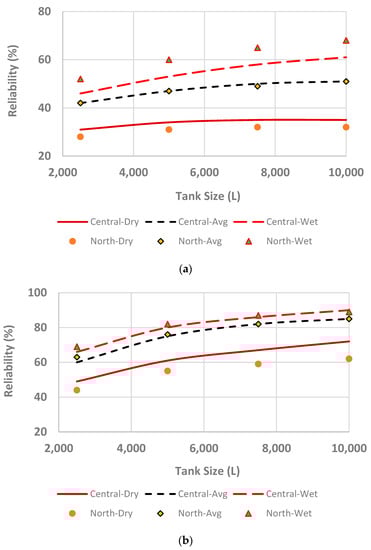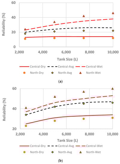 Figure 7a,b shows the variations of reliability values with different tank sizes up to 10,000 L under different weather conditions for a higher non-potable water demand scenario (600 L/day, i.e., 4 people) for two roof areas; (i)