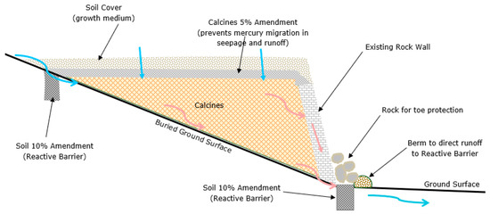 Site 2 amended calcine pile’s vertical cross-sectional design. Blue arrows show the flow paths of infiltrating water that does not contain leachable Hg. Pink arrows show the flow paths of seepage that could contain Hg. The reactive barrier at the downslope edge of the calcines is intended to prevent the migration of Hg through the amended seepage face.