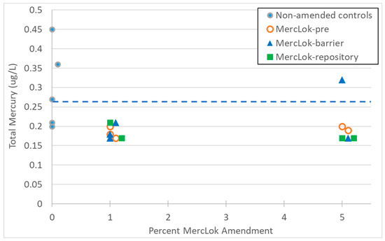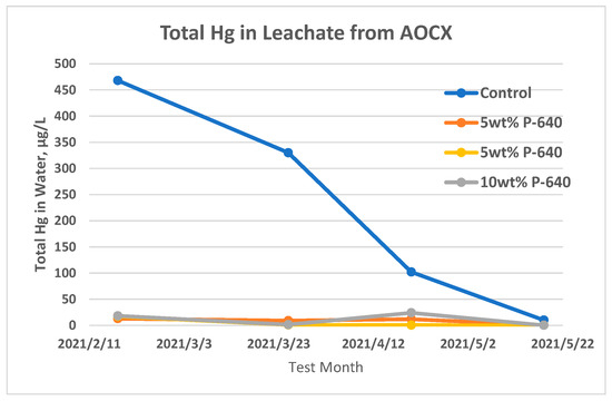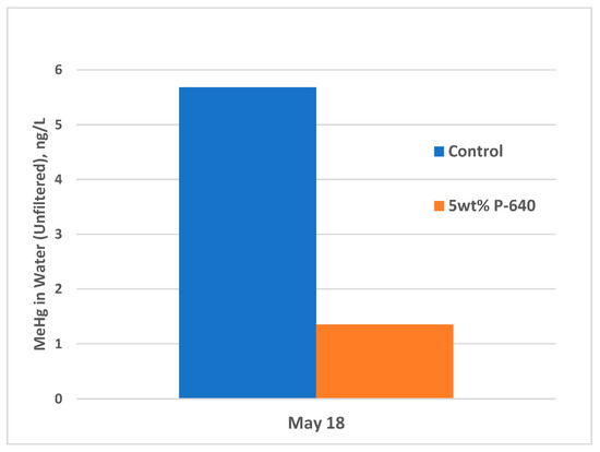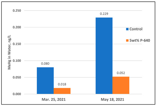 Samples for methylmercury (methyl Hg) in leachate were taken during the second and final sampling periods and only from buckets with 5 wt% of MercLok dosed into AOC-6 and AOC-X. Methyl Hg concentrations in leachates were reduced by 77% and 78% from AOC-6 (Figure 5) and 76% from AOC-X (Figure 6). Since other testing has shown that methyl Hg reduction has a similar slope to total Hg, it is expected that the analysis of methyl Hg from the 10 wt% dosages of MercLok in AOC-X would have resulted in even greater reductions. The analytical results for other total metals in leachate are available in Supplementary Table S1.