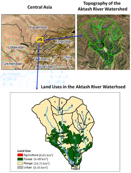 The ARW is located 60 km from the capital Tashkent on the southern slope of Karzhantau, Uzbekistan (Figure 1). The elevation is 1100–1600 m above sea level, with approximately 71% of the slopes angled at 25°. The watershed has a mild climate with a hot and dry summer (average maximum temperature of 27.2 °C in July) and a cold winter (average minimum temperature of −3 °C between December and February) [,]. Based on the data downloaded from the World Weather for Water Data Service (W3S), University of Guelph, Canada (https://www.uoguelph.ca/watershed/w3s/, accessed on 4 July 2023), the average annual precipitation was 1164 mm from 2001 to 2019. Streams in the ARW are largely fed by snowmelt and stormwater. The average streamflow from 1947 to 1965 was 0.41 m3/s, with a maximum of 7.1 m3/s in March–April and a minimum of 0.08 m3/s in August–January [,]. Streamflow gradually increases from September to February of the next year, with a peak discharge occurring in April–May. Based on the Google Earth database, the ARW consists of 22.90% forest land, 0.04% agricultural land, 1.81% urban land, and 75.26% rangeland, with a total area of 19.55 km2. The ARW was further divided into 17 catchments in this study (Figure 1).