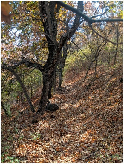 Beginning in 1898 through 1903 and then from 1910 to 1914, almost 700 ha of the lower watershed was afforested to reduce soil erosion and mudflows []. Slopes were terraced manually with ditch terraces and seedlings of broadleaves planted along the slope at a distance ranging from 35 to 50 cm. The dominant species planted were walnut, oak, and juniper, with an admixture of ash, maple, and elm. In addition, seeds of almond, pistachio, walnut, and oak were sown between the terraces. The very dense planting and dry climate have proven unfavorable for the growth and development of walnut, oak, and ash except on north-facing slopes (Figure 2), but openings have been filled by native species, including hawthorns. The success of this early afforestation effort can be seen in the reduction in mudflows and the summer flows of the streams, as compared to the relatively bare slopes of nearby watersheds.