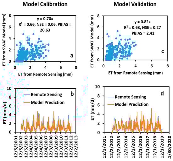 Comparisons of the MODIS-measured and SWAT-predicted daily ETs during the model calibration (a,b) and validation (c,d).