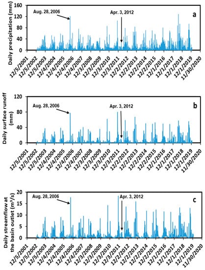 Daily variations in precipitation, surface runoff, and streamflow over the past 17-year simulation period from 2003 to 2019 at the ARW are shown in Figure 4. The daily precipitation was the model input data, whereas the daily surface runoff and streamflow were the simulation results. In general, the daily surface runoff (Figure 4b) corresponded reasonably well with the daily precipitation (Figure 4a). For instance, the daily surface runoff was 77.5 mm on 28 August 2006, when the daily precipitation was 121 mm, whereas the daily surface runoff was 6.2 mm on 3 April 2012, when the daily precipitation was 26.3 mm.