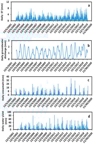 Simulated daily ET (a), groundwater discharge (b), snowmelt (c), and water yield (d).