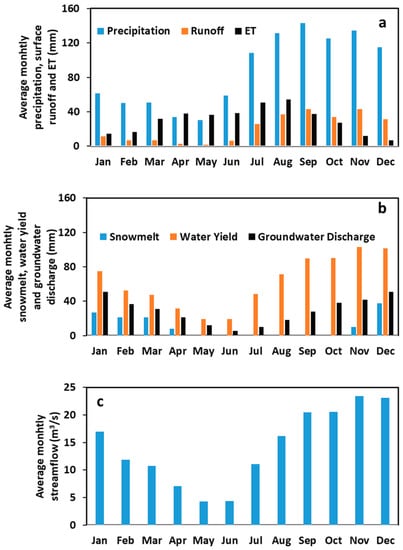 Monthly average precipitation, surface runoff, and ET (a); snowmelt, water yield, and groundwater discharge (b); and stream discharge (c).