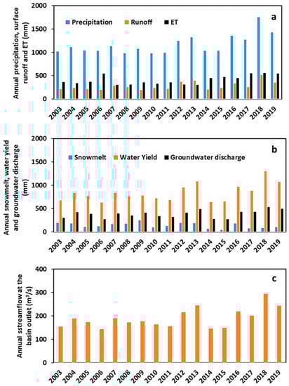 Annual precipitation, surface runoff, and ET (a); snowmelt, water yield, and groundwater discharge (b); and stream discharge (c).