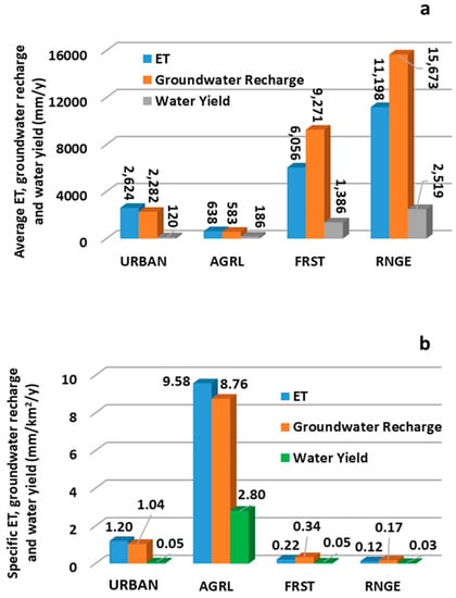 Impacts of land use and land cover (LULC) on ET, groundwater recharge (i.e., water flow from vadose zone soils and streams to aquifers), and water yield are shown in Figure 8. The major LULCs at the ARW included urban (URBAN, 0.35 km2), agriculture (AGRL, 0.01 km2), forest (FRST, 4.48 km2), and range land (RNGE, 14.71 km2). Figure 8a shows the annual average ET, groundwater recharge, and water yield from the urban, agriculture, forest, and rangeland. On average, they were in the following order: rangeland > forested land > urban > agricultural land for groundwater recharge and ET was rangeland > forested land > agricultural land > urban for water yield.