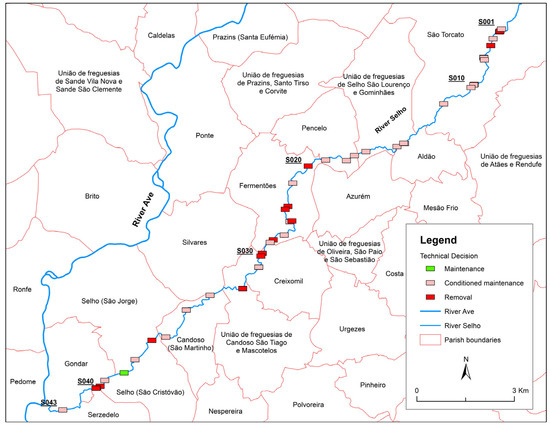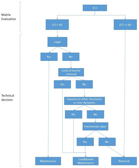 - Conditional Maintenance—whenever one of the conditions defined for the “Removal” decision or other duly substantiated factors were not met. It was the case of the ignorance of the legality of the weir, the costs with barrier removal, impacts of removal in other structures or river/ecosystem dynamics, or patrimonial value of the infrastructure.