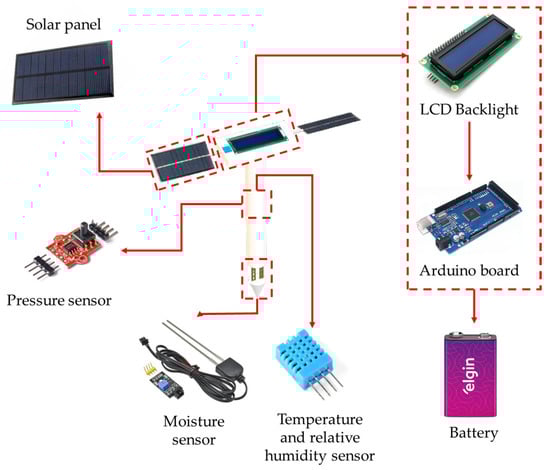 After the testing phases, the Arduino Mega board was permanently connected to the soil moisture sensor structure, containing the programming for all the sensors and the memory for intelligent joint operation (Figure 4). All the information was displayed on the LCD screen (Figure 1).