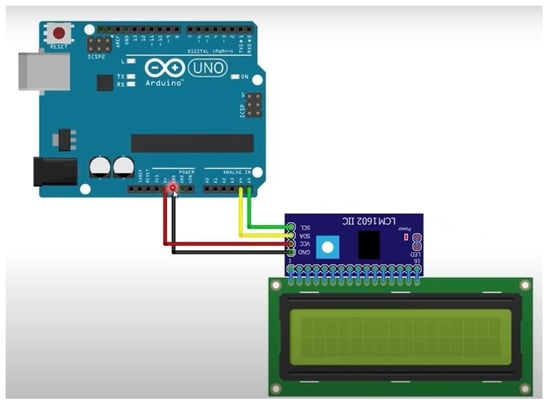 The connections with the Arduino board were made through the Serial Data Line and SCL (Serial Clock Line) pins, allowing various ports on the Arduino board to easily connect to the other sensors used (Figure 2). The connection was made using the I2C module, linking the I2C screen to the Arduino Mega board.