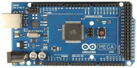 All the sensors were calibrated and controlled using an Arduino Mega board (Figure 3), and the programming language used was C++. The software used was the Arduino IDE. The modules directly connected to the board are the soil moisture sensor, air humidity sensor, air temperature sensor, and pressure sensor.