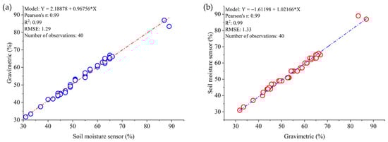 Regression models for validating the soil moisture sensor vs. gravimetric method and (a) gravimetric vs. soil moisture sensor method (b) in the okra crop are preceded by their respective coefficients of determination (R2), Pearson correlation coefficient (r), and root mean square error (RMSE).