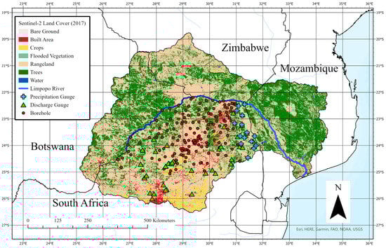 A land cover map of the Limpopo based on Sentinel-2 from ESRI, overlaid with in situ sites and the main channel of the Limpopo River.