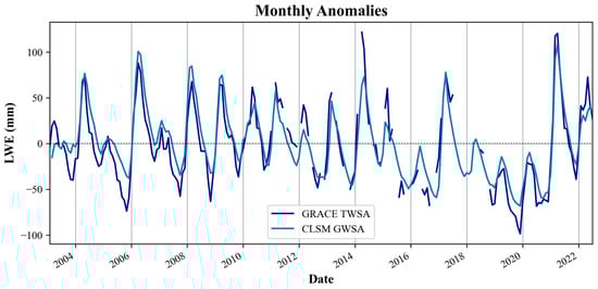 A groundwater level dataset from the South African Department of Water and Sanitation (SA DWS) containing more than 1000 borehole sites matching the South African extent of the Limpopo River Basin was selected to assess the groundwater storage anomalies derived from the GRACE-assimilated CLSM groundwater data—further validated with remotely sensed GRACE TWSA mascon solutions (Figure 2)—and build confidence in using the CLSM outputs for further drought index analyses. The borehole sites were filtered to 172 records based on location, limited to records north of greater Pretoria to remove unnatural groundwater level fluctuations due to irrigation and urban abstraction. The water level data were then linearly interpolated for temporal continuity and standardized for comparison with the basin-averaged CLSM groundwater storage anomalies, as shown in Equation (1):