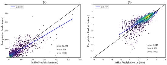 Validation for monthly GPM IMERG precipitation: (a) monthly accumulation; (b) log-transformed accumulation.