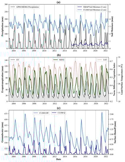 Soil moisture estimates at both the surface and root zone layer from CLSM were investigated. Due to the lack of in situ soil moisture data, downscaled 1 km volumetric water content based on remotely sensed brightness temperatures captured with the passive L-band radiometer on board the Soil Moisture Active Passion (SMAP) mission were assessed for similar drying and wetting signals []. The selected soil moisture product has a spatial resolution of 1 km at near daily resolution, with a reported unbiased root mean squared error of 0.063 m3m−3. This soil moisture product is engineered using the thermal inertia principle and requires both MODIS LST and NDVI products []. Iterations of this product have been generated using a combination of various sensors, including the Advanced Microwave Scanning Radiometer (AMSR) for Earth Observing System [], AMSR-2 [], and aircraft and field experiments [,]. Both the surface soil moisture estimates from CLSM and SMAP estimate the water content within the top 5 cm, which must be multiplied to the volumetric soil moisture to get a liquid water equivalent length. All variables mentioned so far are plotted in Figure 4 to provide context.