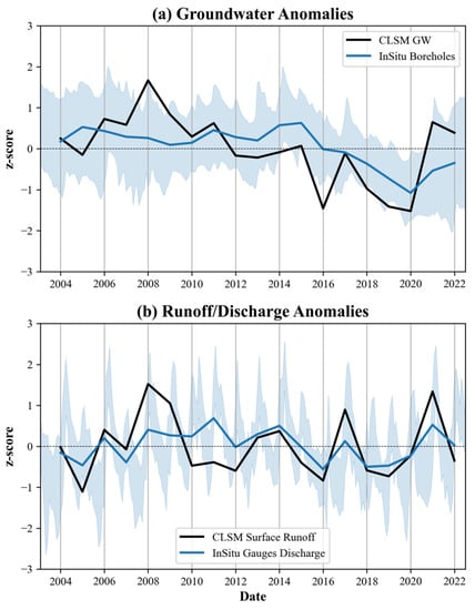 Figure 5a shows that the gridded GRACE-assimilated CLSM groundwater storage anomalies capture the decreasing trend in groundwater levels, matching the annual trend by growing season, of the distribution of in situ groundwater level anomalies to within one standard deviation (highlighted in a lighter shade of blue). The CLSM anomalies exhibit a relatively greater annual magnitude in the growing season, oscillating between −1.5 and +1.9. The in situ anomalies hover above 0 between 2006 and 2016, after which there is a steady decreasing trend to about −0.5 by 2021. However, the CLSM anomalies further show a recovery beyond 2020, trending positive to a peak anomaly of about +0.8 in 2021; the in situ anomalies do not reach a baseline of 0. Interestingly, the trough in 2016 is not captured with the in situ data, and the rebound in groundwater levels is not as dramatic between 2020 and 2022. Below, (b) shows the transformed and standardized seasonal in situ discharge and CLSM surface runoff estimates. Compared to the groundwater anomalies, the in situ discharge observations show more resilience, returning to a baseline of 0 after the 2016 drought. The CLSM surface runoff also exhibits a similar pattern as the monthly discharge totals, except the peak in 2008 and trough in 2010–2012. The naturally low flows of this basin likely cause the minimal variation in discharge or runoff anomalies, in contrast to the visibly more negative groundwater anomalies of 2016 and 2020, based on Figure 5a.