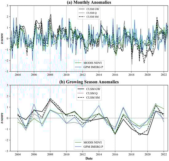NDVI and precipitation anomalies are plotted with components from CLSM plotted (a) for all months and (b) for the growing season.