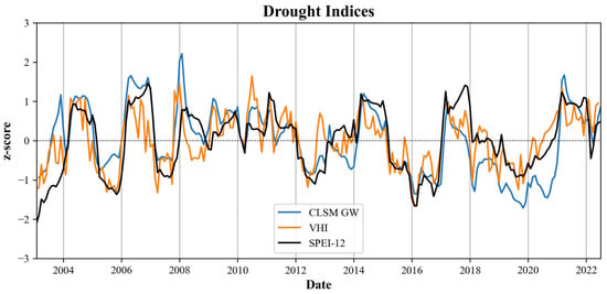 Figure 7 shows the plot of drought indices calculated for the LRB. The SPEI-12 and VHI are somewhat correlated, but the groundwater storage anomalies appear to show more intense wet and dry periods, approaching a maximum z-score of 2.2 in early 2008 and a minimum z-score of −1.7 in late 2019. The VHI has greater variance due to its seasonal cycle, and at times do not agree with either the SPEI-12 or groundwater anomalies. For example, in late 2012, healthier vegetation conditions (0.5) were observed in the growing season months despite lower groundwater (−1.2) and SPEI-12 z-scores (−1). A similar example is shown during the rebound in water storage after the 2020 drought, in which the VHI approaches positive z-scores sooner than either the groundwater anomalies or SPEI-12. Given that the VHI is influenced by NDVI, the plot in Figure 6b reveals a similar decoupling as Figure 6a and Figure 7, in which the NDVI anomalies are relatively higher during some droughts (z = −0.6 for 2020) but lower for the rainier growing seasons in 2006 (z = 0) and 2008 (z = 0.75) compared to the CLSM soil moisture, groundwater, and runoff anomalies.