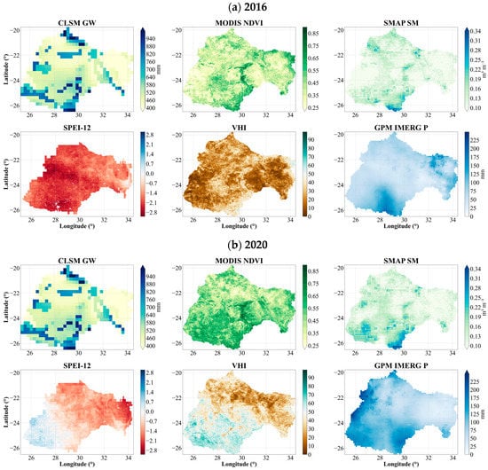 Anomalously dry growing seasons: January 2016 (a) and 2020 (b).