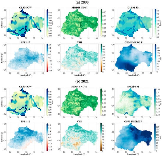 Therefore, the relationships and statistical metrics for NDVI and CLSM-based anomalies suggest that ecological drought conditions with respect to vegetation health may not inherently follow hydrological drought conditions, at least according to the available record of modeled groundwater storage anomalies in the LRB. One concerning conclusion is that groundwater storage overall has depleted, despite the temporary relief in 2021 (Figure 3a and Figure 10). Because the record-breaking drought of 2016 was particularly intense due to a strong El Niño event, water management practices must become even more precautious in preparation for such future events [,,]. Therefore, vegetation health in the eastern LRB cannot be used to assess groundwater availability, though it may be in the more arid climate of the central west region.