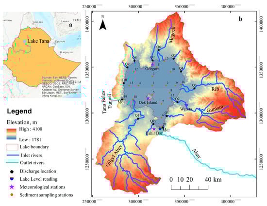 Lake Tana in the Blue Nile headwaters is in the northwestern highlands of Ethiopia (Figure 1). The lake has a nearly circular shape, a 3046 km2 surface area, and a volume of 29 km3 []. The lake is, on average, 10 m deep and the water mixes. Hence, vertical temperature gradient is not observed [,]. Lake Tana is the largest lake in Ethiopia []. It is a natural reservoir for Tana Beles and Tis Abay I and II hydropower plants []. The lake has great ecological importance. It is used for fishing, transportation, tourism, irrigation, and drinking. More than five hundred thousand people directly or indirectly depend on the lake and adjacent wetlands [].