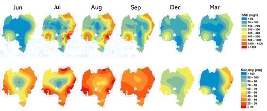 Spatially, during the rainy monsoon phase (July and August), the sediment concentrations were the most elevated, and the Secchi depths were the smallest at stations close to the major river inlets, namely 15, 16, 17, and 18. The stations at the center and northwest of the lake had the smallest concentrations and greatest light transparency (Figure 1 and Figure 3) for the locations of the stations. In addition, in the stretch from Megech to Gumara, the shallowest portion of the northeastern part of Lake Tana, the suspended sediment concentrations were elevated throughout the year (Figure 3). The statistics of the temporal values are summarized and presented in Table 1.