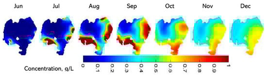 Figure 5 shows the concentration of the tracer applied in the rain phase in the four main rivers from 1 June to 31 August. In Figure 5, all the tracer concentrations from the four main rivers are superimposed. The tracer distribution for the four individual rivers is depicted in Figure 6. The tracer concentration over time at the outlet and in the lake center is shown in Figure 7. The tracer concentrations indicate the general suspended sediment flow path, nutrient, and potential distribution when the sediment pickup from the bottom due to wave action and sediment deposition is not considered. Thus, the decrease in tracer concentration is due to the dilution.