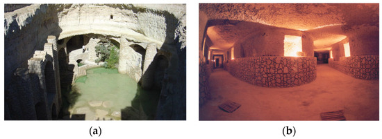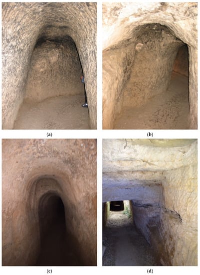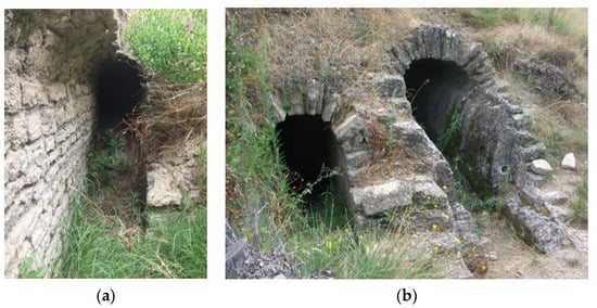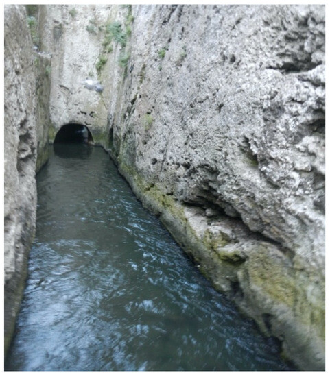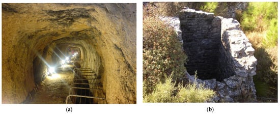 Tunnels dug into solid rock to access groundwater were built to provide water for many ancient aqueducts. They have been thoroughly studied by speleologists in Italy [64], where more than 140 such spring tunnels from Etruscan, Greek, and Roman construction have been described in the “ancient aqueducts of Italy” project [64]. These are complex structures meant to capture enough water to fill an aqueduct downstream. Some are similar in purpose to qanats, but were built by driving a horizontal shaft into the rock without the help of vertical access shafts. Longer spring tunnels, however, were built as proper qanats, with vertical access shafts from which the tunnel was dug in two directions. Examples are tunnels for the Roman aqueducts of Xanthos (Figure 12), Turkey [65]; Sexi, Spain [66,67,68]; Zadar [69,70] and Novalja, Croatia [71]. There are also several examples in the middle east, especially in Syria [72,73]; in Northern Africa [74]; and, curiously, in western Germany [14,15,75]. A unique case is the tunnel that was excavated to tap the underground water source of Uxellodunum during a siege in the Gallic wars to force the inhabitants to surrender [76].