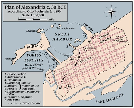 In Alexandria, a city in the northwest part of Egypt, the Greek engineer Archimedes supervised the construction of an overturned (or inverted) siphon to transfer water for kilometers and hundreds of meters of hydraulic heads. These pipes were mostly made of stone and helped transfer Nile water in aqueducts across valleys to the city [24]. A map of ancient Alexandria with a channel of the Nile Delta is shown in Figure 3.