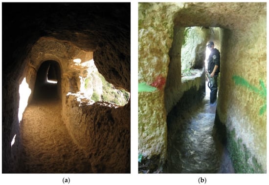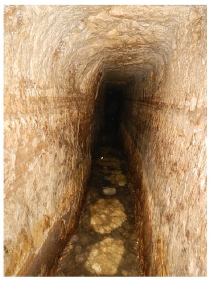 One of the oldest tunnels in the world was built below Jerusalem in the 8th century BC from the Gihon karst spring to the Siloam pool [40,41]. Known as Hezekiah’s tunnel (Figure 7), this 500 m long structure was built by drilling from the spring and the destination pool in two directions (counter-excavated tunnel), meeting in the middle. The tunnel still carries water.