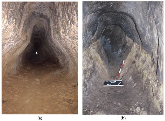 Conduits built into an aqueduct tunnel: (a) Sernhac tunnel, France; a masonry channel was built into the tunnel for passage of the Nîmes aqueduct (Photo (a)—Cees Passchier). (b) Cave de Curée, with a vaulted aqueduct channel in the tunnel, part of the Gier aqueduct of Lyon, France—(http://www.romanaqueducts.info/, accessed on 15 August 2023).