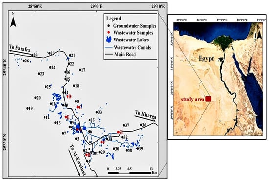 - Darwish, M.H.; Sayed, A.G.; Hassan, S.H. Assessment of Water for Different Uses at Some Localities of the Dakhla Oasis, Western Desert, Egypt. Water Air Soil Pollut. 2023, 234, 516. [Google Scholar] [CrossRef]