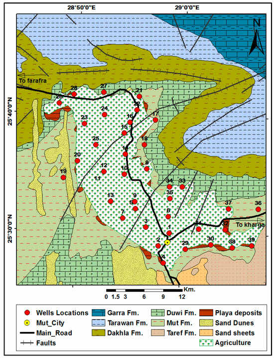 Dakhla, located in the Western Desert of Egypt, stands as the largest oasis, with a depression encompassing several smaller oases. These are interspersed by hills or desert expanses but remain relatively close to each other. Mut, positioned at the center, holds the distinction of being the largest settlement within the oasis, while Qasr is situated to the west (Figure 1). The study area specifically encompasses the central part of the El-Dakhla oases. Due to infrequent rainfall leading to a scarcity of surface water, the region heavily relies on groundwater resources. This dependence on groundwater requires the adoption of safe management practices to maintain its suitability for diverse uses. Different studies worldwide have evaluated the suitability of groundwater for different purposes using diverse methods across different regions, for instance, [1,2]. It is common for groundwater resources to be overexploited in arid and semi-arid regions due to doubtful quality and quantity of surface water supplies [3,4,5,6]. Minerals play the main role in the chemical composition of the water in which they dissolve until the process of ion exchange balances. Several factors determine the chemical composition of water, including precipitation, mineralogy, topography, and climate. During the groundwater circulation process, the type of geological formation affects the hydrochemistry of groundwater [7]. About one-fifth of the world’s population depends on groundwater for consumption for various uses [5,8]. Currently, there is a rising preference and demand for groundwater, primarily attributed to its lower susceptibility to pollution when contrasted with surface water [9]. In arid and semi-arid regions, the imperative for sustainable agriculture is escalating to cater to the expanding population, thereby necessitating access to suitable water for irrigation [10,11]. Because groundwater is used for many purposes, such as domestic, agricultural, and industrial applications worldwide, evaluating its levels and quality is crucial [12]. Freshwater sources are deteriorating due to a major problem caused by rising pollution and climate change [13]. The use of water resources, particularly for the supply of drinking water, is negatively impacted by this degradation. Public health issues have been associated with low water quality, mainly because of the spread of diseases transmitted through the water. Seasons and locations affect groundwater quality. The type of aquifer, pumping rates, precipitation, evapotranspiration, mineralogy, and water leakage from irrigation and drainage networks are just a few variables affecting groundwater quantity and quality [12].