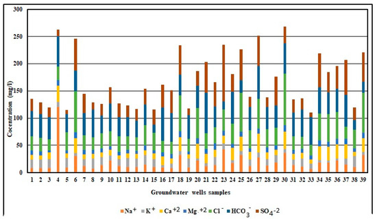 Chloride ions exist in all drinking water, exhibiting an average of 3 mg/L in rainwater and soaring to 19,000 mg/L in seawater [53]. Water containing less than 150 mg/L of chloride is considered suitable for a wide range of purposes. In the study area, chloride concentrations in groundwater range between 19.23 mg/L (sample No. 33) and 94.7 mg/L (well no.30), and were within the acceptable limit of 250 mg/L (WHO [52]), while in wastewater lake the chloride content ranges between 928.6 mg/L (sample No. D) and 43,693 mg/L (sample No. A), and was above the acceptable limit of 250 mg/L (WHO [52]).