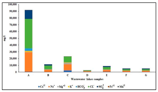 Magnesium is similar to Ca2+ as a principal cation in the groundwater and surface water, and as a major cause of water hardness. Occasionally, magnesium is mixed with calcium carbonate and clay minerals in sedimentary rocks to form magnesite and other carbonates. Magnesium and calcium are in equal amounts in the case of dolomite. The concentration of Mg2+ in drinking water is usually less than 50 mg/L, but in ocean water is about 1000 mg/L and reaches 57,000 mg/L in brines. If it is present in a high concentration, it will have laxative effects. In the current study, Mg2+ content in groundwater well samples ranged between 3.36 mg/L (sample No. 3) and 11.18 mg/L (sample No. 18), and was below the acceptable limit of 30 mg/L (WHO [52]), while in wastewater lakes and canals, the Mg2+ ranged between 61.97 mg/L (sample No. B) and 1840 mg/L (sample No. C), and was higher than the acceptable limit of 30 mg/L (WHO [52]).