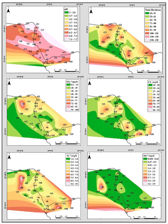 The spatial distribution of the pH, TH, SO4−2, Cl−, Fe+2, and Mn+2 in the water samples.